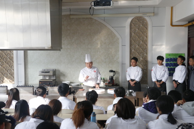 活动中,潘厨首先介绍了青岛中心假日西餐厨房的特点,又结合其服务上合峰会的经历以及多年的从事西餐制作的经验,基于传承经典,创新形式的原则,向在座的师生演示了伊朗鹰嘴豆泥、奶油菠菜汤、水煮三文鱼、孔府酱烧牛肋骨虾球等经典的穆斯林传统菜品,融合了中西餐文化知识,语言幽默,技艺精湛,讲解精彩,现场师生共鸣强烈,开阔了实训员工的眼界,为即将走向实训岗位的员工讲解了一线星级餐厅应该注意的问题和应该了解的厨房知识,激发了员工努力学好烹饪