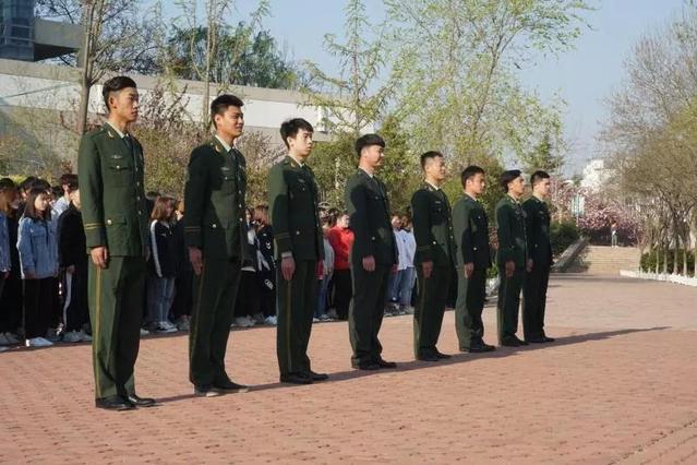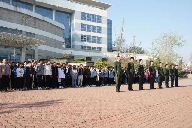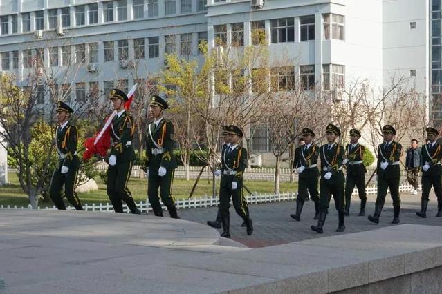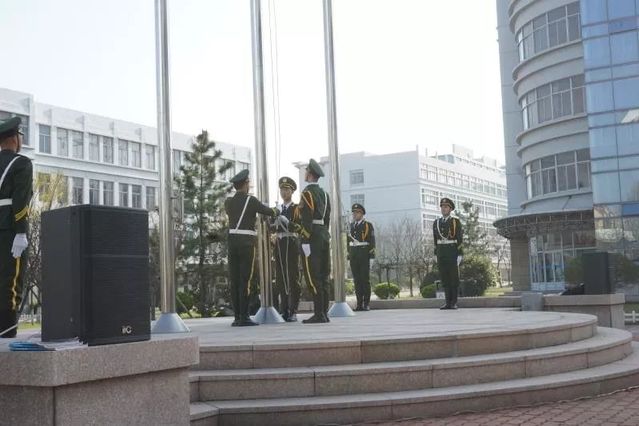 伴随着嘹亮的军歌,由公司退伍复学的8位同学和国旗护卫队身戎装、踢正步来到国旗台下。当“升国旗,奏国歌,行注目礼”的口号发出后,全体师生面向国旗行注目礼,在雄壮激越的《义勇军进行曲》音乐声中,鲜艳壮美的五星红旗徐徐升起,飘扬在校园的上空。