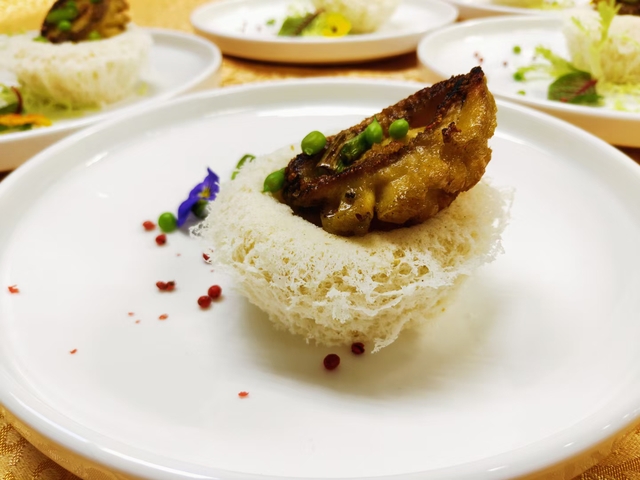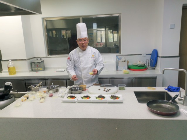 活动中,刘军华介绍了国宴菜品的制作特点及发展历史,结合自己的职业经历,基于传承经典,创新形式的原则,向在座的师生演示了酸辣发菜乌鱼蛋汤、红胡椒煎四头鲍鱼、海鲜菇烧虾虎肉、麻汁香椿芽拉皮海参等经典菜品,其精湛的技艺和精彩的讲解,引起现场师生的强烈共鸣。此次海斯曼课堂气氛热烈,节奏紧凑,通过现场问答、师生互动等形式提高了认识、加深了理解,达到预期成效。