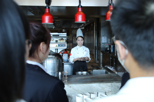 仪式过后,王珊珊老师现场精心为酒店厨房工作人员及公司实习生演示了菜品,开始了她在服务站的第一课。