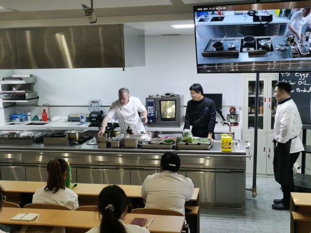 活动期间,青岛海天大酒店行政副总厨DIVIKI Szabolcs、青岛涵碧楼酒店行政总厨李朝斌、青岛香格里拉大酒店行政饼房厨师长梁志超分别为烹调工艺与营养、西餐工艺、中西面点工艺等专业员工进行了技能演示及交流。大师们结合菜品的制作,从刀工、油温、烘焙、装盘、色泽搭配等细节进行了精心讲解,并围绕各自的成长经历、餐饮业发展趋势以及酒店厨房管理模式等问题,为员工成长成才、实习就业解答困惑、提供指导。