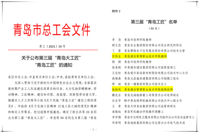 本网讯(工会 吴春雷)近日,青岛市总工会下发《关于公布第三届“青岛大工匠”“青岛工匠”的通知》,对“青岛大工匠”“青岛工匠”予以通报,公司伟德国际victor1946张桂凤、任传生两名教师获评“青岛工匠”。