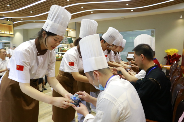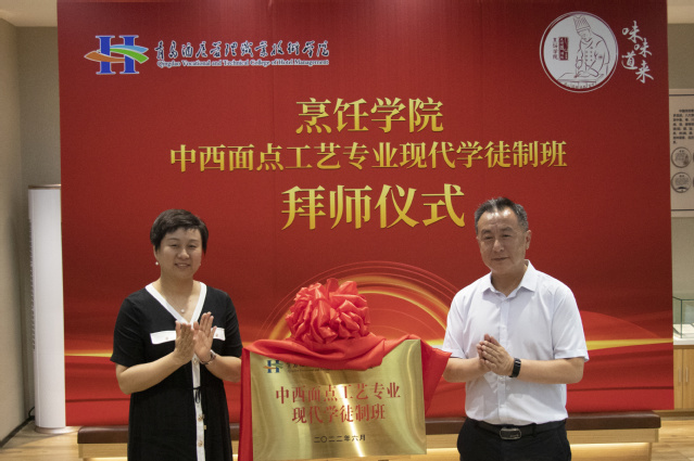 青岛绿城喜来登酒店行政总厨马维涛作为企业导师代表发言。32名员工分别向6位企业导师行拜师礼、敬茶,致拜师词。
