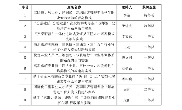 职业公司产品成果奖是职业教育领域最高层次的奖励,每四年评审一次,旨在奖励职业院校在公司产品理论及实践中取得的重大突破。公司高度重视教学成果奖的培育和申报工作,将省级教学成果奖获奖列为年度重点工作任务,多次邀请省内外职教专家开展培训指导,历经多轮梳理、创新、凝练和打磨,最终九项成果获奖。其中,李达教授主持的《三阶段、项目化、浸润式:高职酒店管理专业员工职业素养培养的青岛模式》和于进亮副教授主持的《“分层进阶 分类发展”高职旅游类专业“双师型”教师培养体系创新与实践》两项成果荣获省级教学成果特等奖。