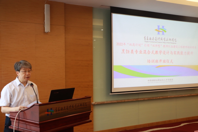 仪式上,宫恩龙介绍了公司办学历史、办学特色和专业建设情况,向来校参加培训的各位学员表示热烈欢迎。他指出,烹饪类专业混合式教学设计与实践能力提升培训旨在针对中职烹饪类教师混合式教学能力提升需求,充分发挥公司烹饪专业在团队、实训条件、理念及实践经验方面的优势,通过丰富多彩的培训内容形式,切实提升中职烹饪类教师混合式教学的理论基础和应用能力,公司将全力以赴、积极主动地做好各项服务工作,确保培训任务顺利完成。