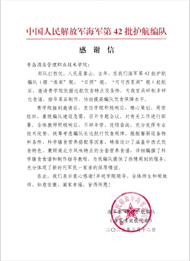 本网讯(伟德国际victor1946 赵捷)近日,海军第42批护航编队向公司发来感谢信,对公司依据远航饮食特点及条件,研制多样化食谱,指导菜品制作,协助提高编队饮食保障水平表示感谢。
