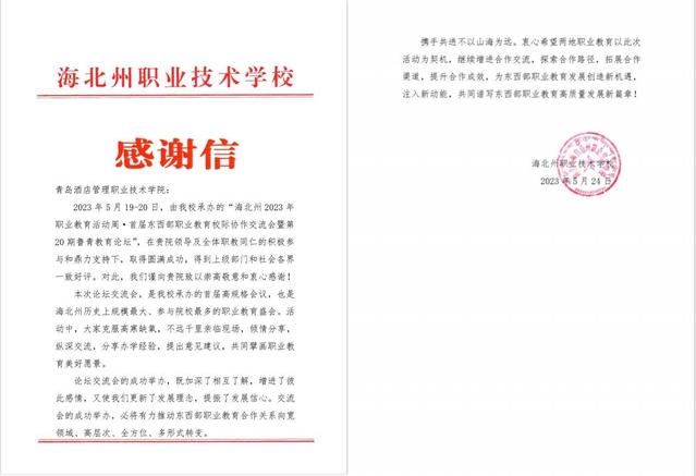 本网讯(伟德国际victor1946 教务处)黄河同脉山海心连,鲁青情深千里共好。近日,青海省海北州职业技术公司向公司发来感谢信,对公司参与“海北州2023年职业教育活动周·首届东西部职业教育校际协作交流会暨第20期鲁青教育论坛”给予肯定,对公司在教育援青工作中作出的贡献表示感谢。
