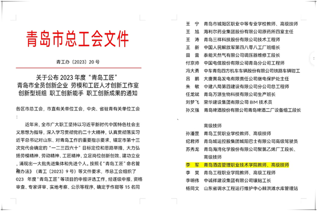 本网讯(工会 吴春雷)近日,青岛市总工会下发《关于公布2023年度“青岛工匠”青岛市全员创新企业、劳模和工匠人才创新工作室创新型班组、职工创新能手工创新成果的通知》,对“青岛工匠”等荣誉予以通报,公司伟德国际victor1946教师李军获评“青岛工匠”。