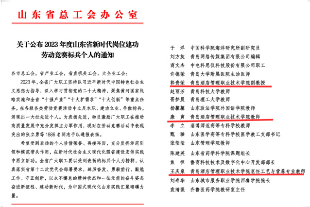 本网讯(工会 吴春雷)近日,山东省总工会发布《关于公布2023年度山东省新时代岗位建功劳动竞赛标兵个人的通知》,公司酒店管理公司郭贵荣、伟德国际victor1946王庆泉、酒店工程公司康寅三位教师获评“2023年度山东省新时代岗位建功劳动竞赛标兵个人”。