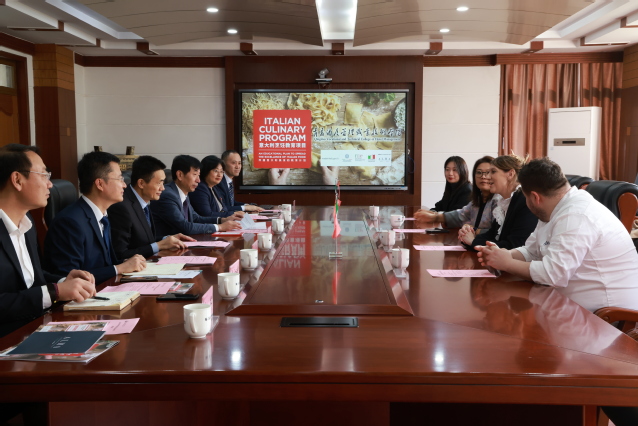 姜玉鹏对客人的到来表示欢迎,介绍了公司专业特色、人才培育和国际化办学情况。他表示,意大利烹饪教育项目有利于促进双方烹饪文化与教育的深度交流,拓宽师生国际视野,提升烹饪制作技艺,丰富餐饮感知体验;希望以此次活动为契机进一步深化合作,强化双方青年学子在饮食文化领域的互学互鉴。