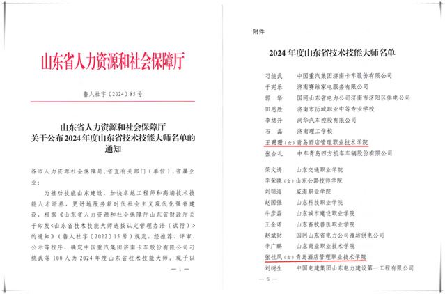 本网讯(组织人事处 教师工作部)近日,山东省人力资源和社会保障厅公布了2024年度山东省技术技能大师名单,公司伟德国际victor1946王珊珊、张桂凤2名教师位列其中。截至目前,公司已有4名教师获评“山东省技术技能大师”。