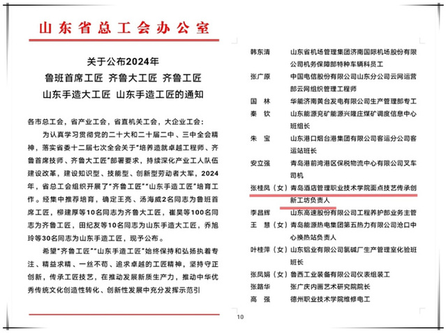 本网讯(工会 吴春雷)近日,山东省总工会下发《山东省总工会办公室关于公布2024年鲁班首席工匠、齐鲁大工匠、齐鲁工匠山东手造大工匠、山东手造工匠的通知》,公司伟德国际victor1946教师张桂凤喜获“齐鲁工匠”荣誉称号。