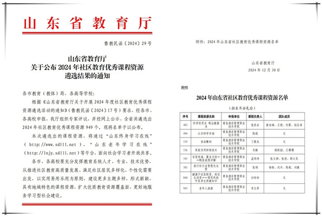 近日,山东省教育厅公布了2024年社区教育优秀课程资源遴选结果,伟德国际victor19462门课程入选。