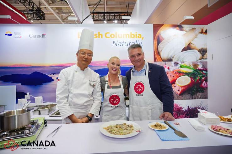 活动期间,公司师生团队设置专属烹饪展示区,现场演绎菜品制作过程,全程负责加拿大海产品的菜品研发与现场推广,通过试吃品鉴、技法讲解等方式向中外观众推广加拿大海产品。加拿大农业部部长麦克唐纳莅临展位视察,亲自参与烹饪环节,与公司西式烹饪工艺专业教师江云涛合作完成数道菜品制作,对公司研发的特色菜品给予高度认可。他表示,本次菜品研发制作活动让更多中国消费者了解加拿大海产品的独特魅力,为中加渔业贸易合作搭建了“美味桥梁”。
